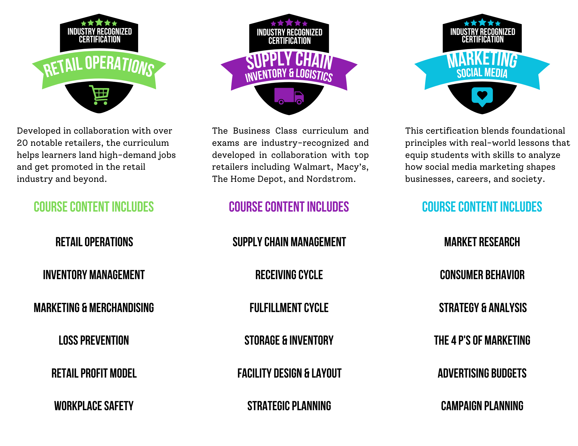 The Business Class curriculum and exams are industry-recognized and developed in collaboration with top retailers including Walmart, Macy’s, The Home Depot, and Nordstrom.